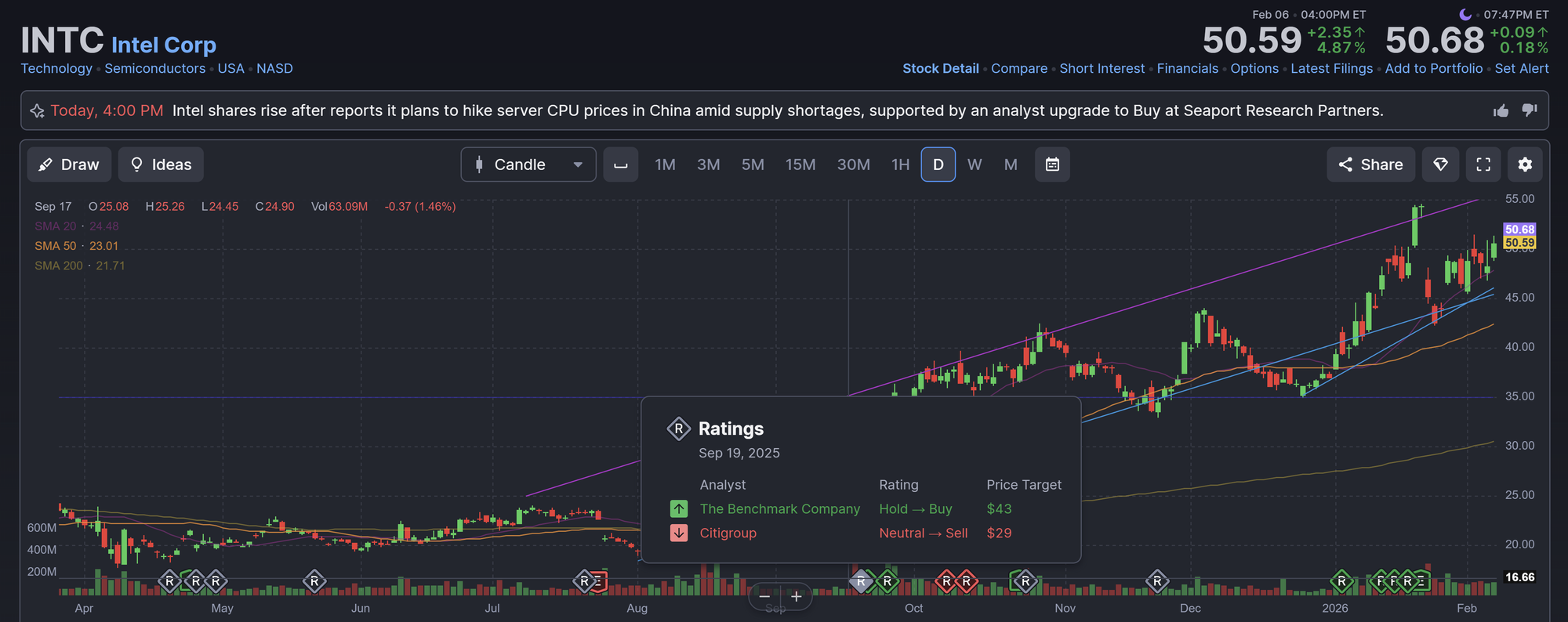 No additional tabs needed. No cross-referencing dates. Just Wall Street ratings shown on every chart aligned perfectly with each candle for seamless before and after research.