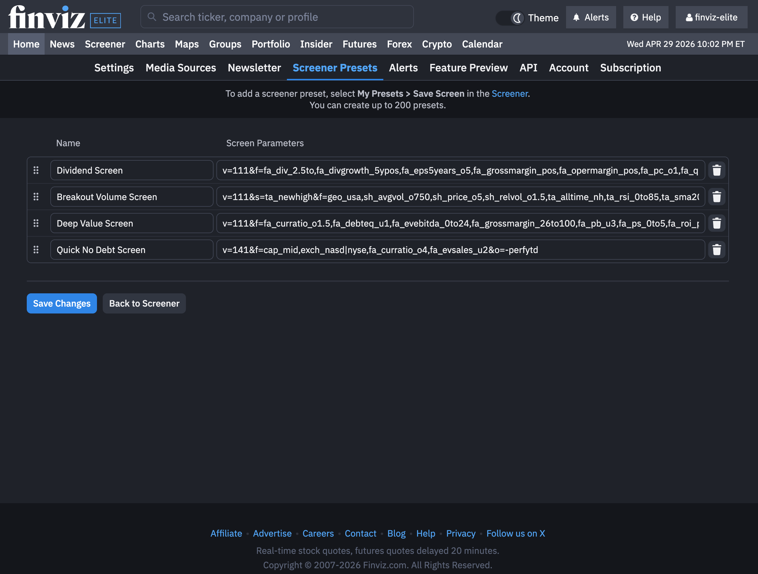 Every time you log into Finviz, your saved screens are instantly available right from the Screener menu and your account. Move seamlessly between trading ideas, keep your workspace clean, and stay focused on execution: