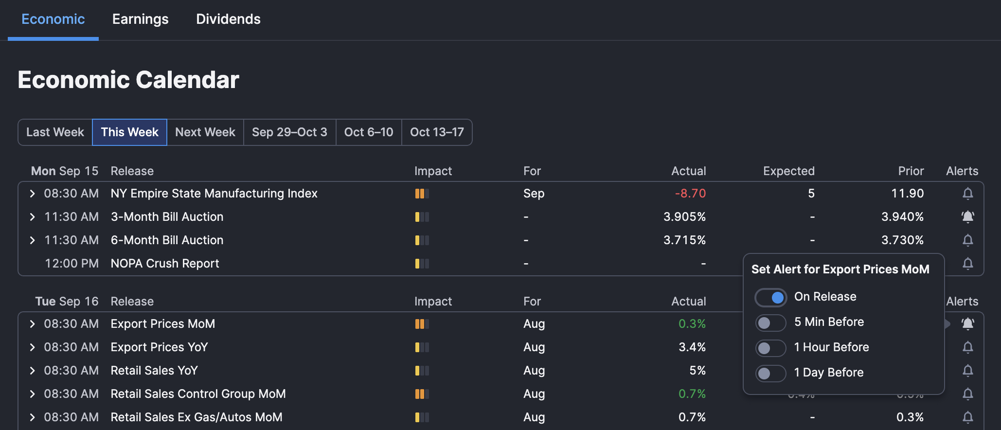 Markets move on events — sometimes because of what’s coming, and sometimes because of what just happened. By combining economic, earnings, and dividend calendars with historical data, Finviz gives you a full timeline of market catalysts at your fingertips.