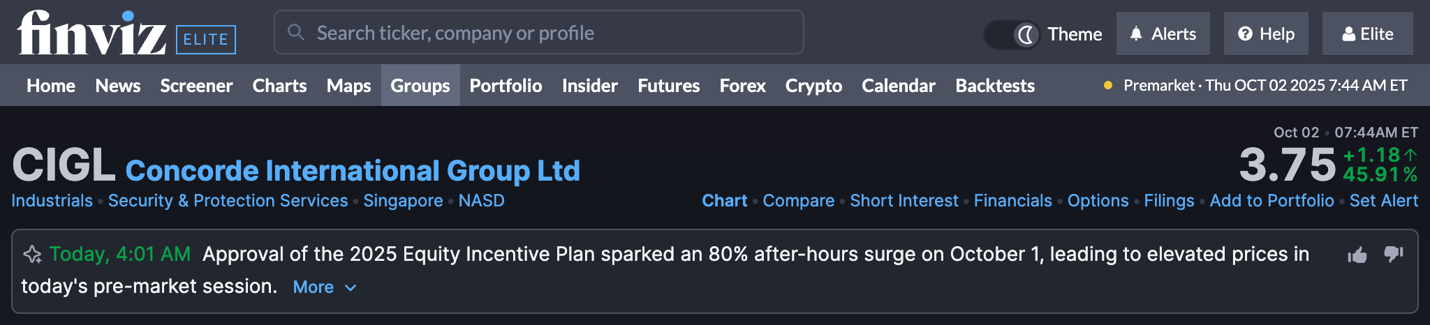 This features is now also on all stock pages. For example, on our Concorde International Group (CIGL) stock page below, we show a news headline at the top with each important detail, timestamped, and displayed clearly as a single sentence: