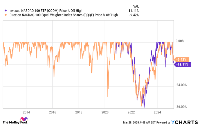 As the chart highlights, over the long term, Invesco S&P 500 Equal Weight ETF has outperformed the regular S&P 500 index, using SPDR S&P 500 ETF Trust as a proxy. But that easy win doesn't work in every case. The Nasdaq-100 index is a good example of why equal weighting could work against you.