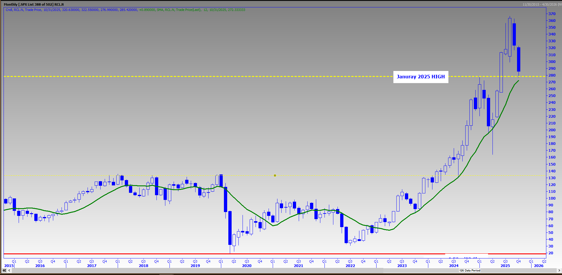 Royal Caribbean Cruises Ltd (NYSE:RCL) stock recently pulled back to a potential support level within the context of a long-term uptrend, as defined by its January closing high at $274 – which is near double major twin peaks in 2018 and 2020 – and the rising 12-month moving average. The latter has also provided excellent buying opportunities for the shares since 2023.
