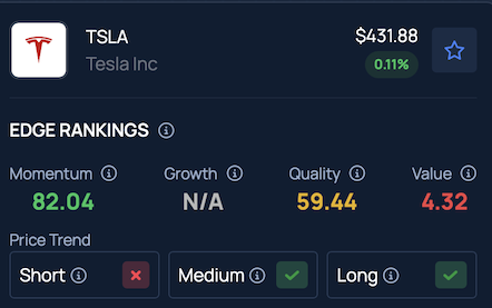 Tesla posts a strong Momentum score but lags on Value, showing solid medium and long-term price trends despite short-term weakness. For more insights like these, sign up for Benzinga Edge Stock Rankings today.