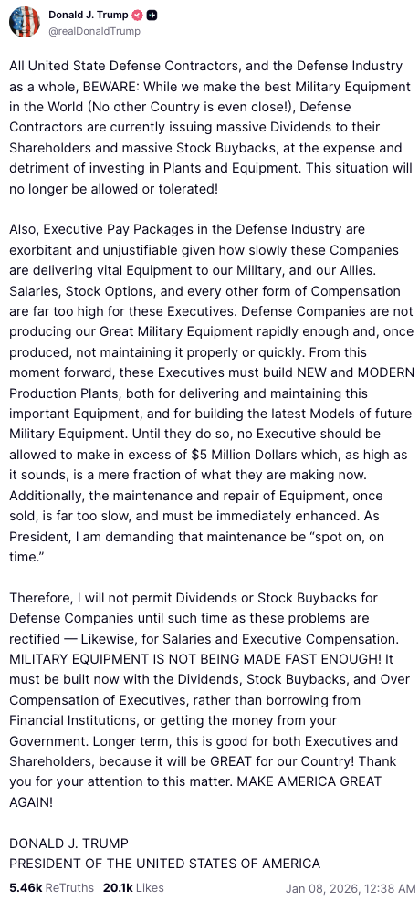 In a sweeping statement, Trump announced that he “will not permit Dividends or Stock Buybacks for Defense Companies until such time as these problems are rectified.”