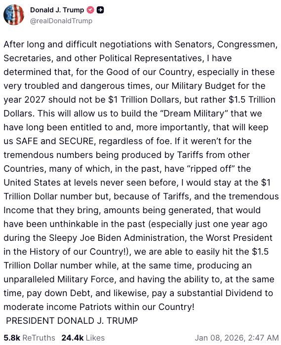 A few hours later, in another post on Truth Social, Trump called for a historic boost to the U.S. defense budget, saying, “Our Military Budget for the year 2027,” should be $1.5 trillion, instead of $1 trillion, while adding that it was essential for building a “dream military.”