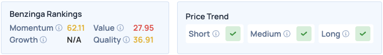 The LMT stock scores poorly on Momentum and Quality in Benzinga’s Edge Stock Rankings, but has a favorable price trend in the short, medium and long terms. Click here for deeper insights into the stock, its peers and competitors.