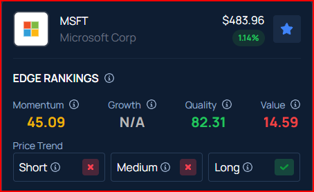 Microsoft holds a momentum rating of 45.09% and a quality rating of 82.31%, according to Benzinga’s Proprietary Edge Rankings. Click here to see how it compares to other leading tech companies.