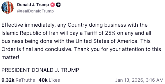 In a Truth Social post on Monday night, Trump said any country doing business with Iran “will pay a Tariff of 25% on any and all business being done with the United States of America,” adding that “this order is final and conclusive.”