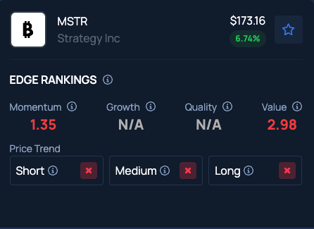 Benzinga Edge Stock Rankings show that Michael Saylor’s Strategy stock has a low Momentum score. Here is how it ranks against Tom Lee-backed BMNR.