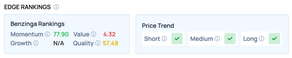 Tesla scores well on the Momentum metric, while offering satisfactory Quality, but poor Value. It also has a favorable price trend in the Short, Medium, and Long term. For more such insights, sign up for Benzinga Edge Stock Rankings today!
