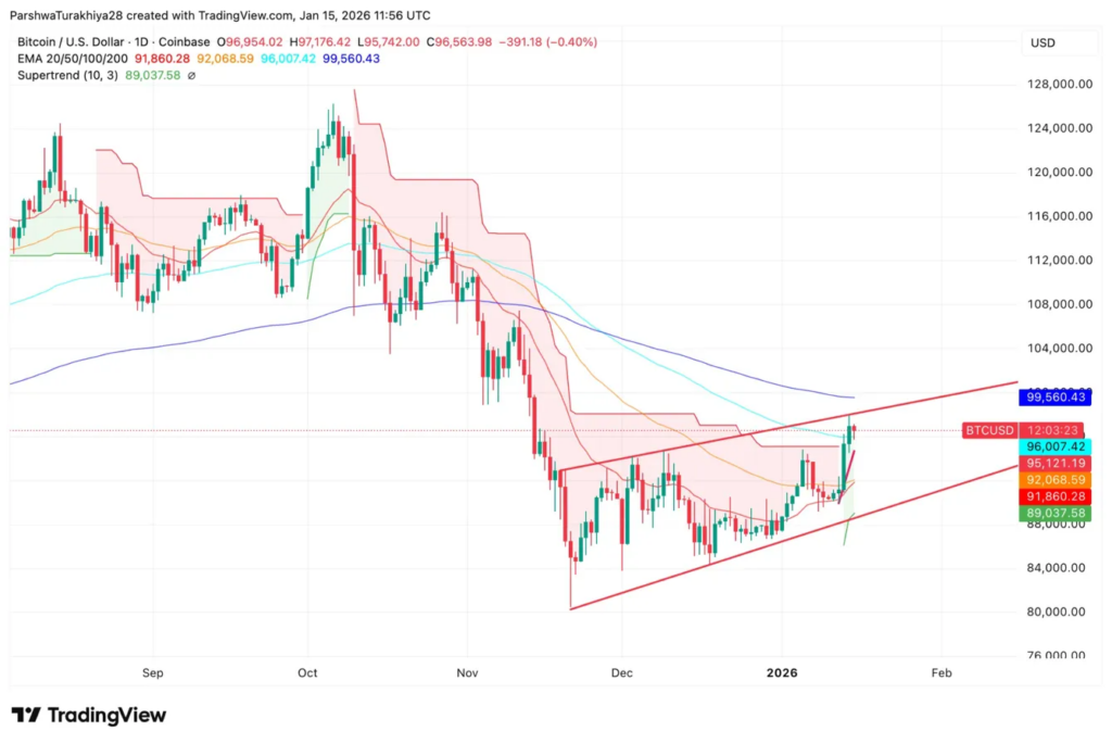 Support sits at $95,000, then $92,000 where moving averages converge, followed by $89,000. Losing $95,000 would signal the breakout attempt failed.