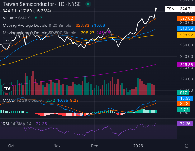 Over the past year, TSM has climbed roughly 68%, rising from around $207 in mid-January 2025 to above $347 in premarket trading following its fourth quarter earnings’ beat.