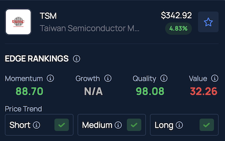 According to Benzinga's Edge Stock Rankings, TSMC demonstrates a strong price trend in the short, medium and long term, despite holding a weak Value rating.