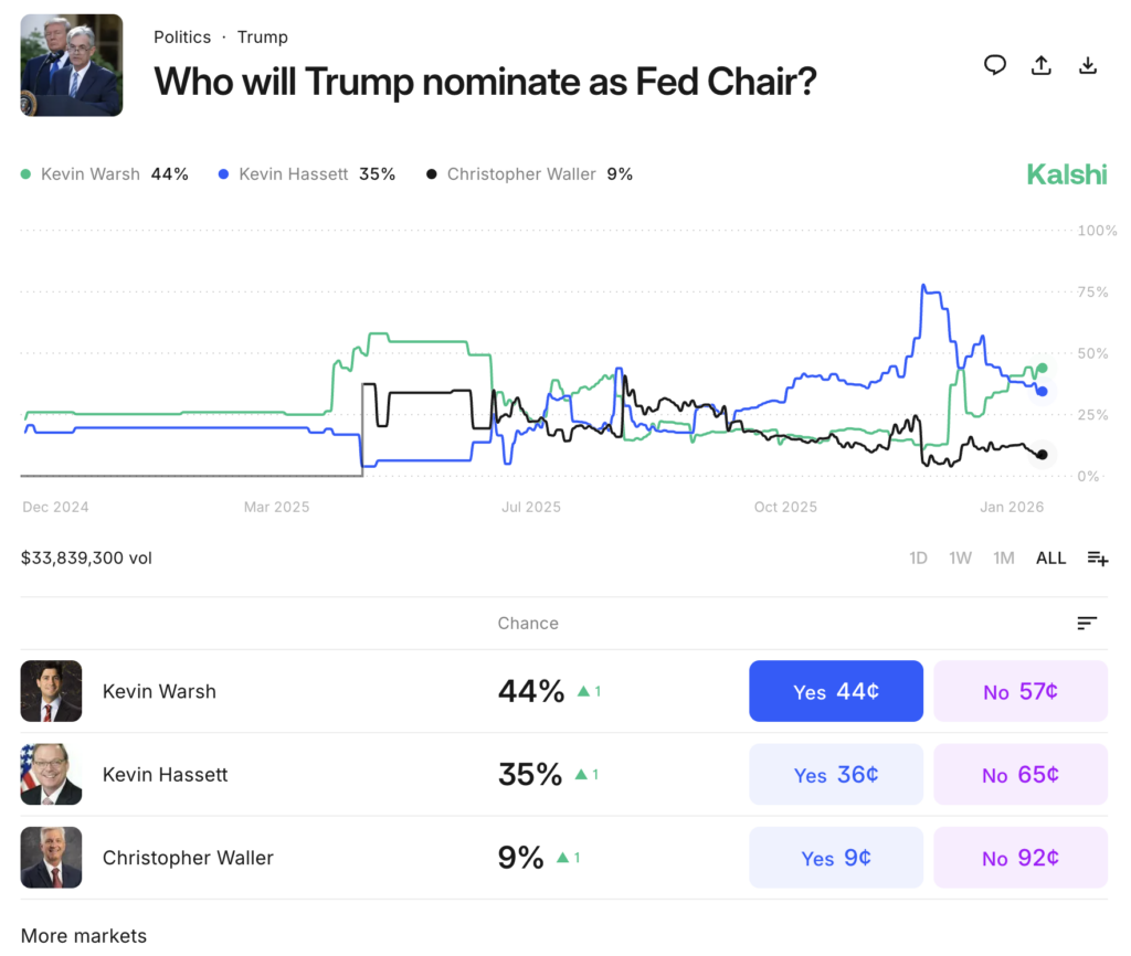 Kalshi prediction markets show Director of the National Economic Council, Kevin Hassett and former Federal Reserve Governor Kevin Warsh as the frontrunners, with odds of 36% and 44%, respectively.