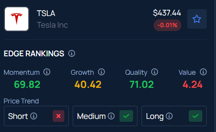 With a strong Momentum in the 69th percentile, Benzinga’s Edge Stock Rankings indicate that TSLA stock is experiencing short-term consolidation along with medium and long-term upward movement.