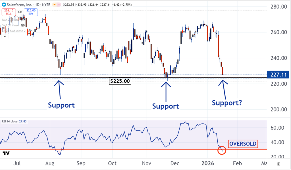 As you can see on the chart, Salesforce has dropped to levels around $225. This price was support in August and November.