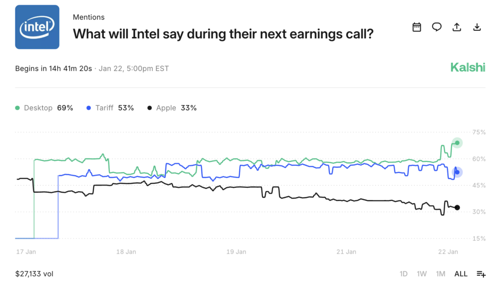 On Kalshi, a regulated prediction market, traders are placing bets on whether specific words will be mentioned during Intel's upcoming earnings call, including the Q&A.