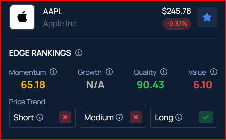 Benzinga's Edge Rankings place Apple in the 90th percentile for quality and the 65th percentile for momentum, reflecting its mixed performance. Benzinga’s screener allows you to compare Apple’s performance with its peers.