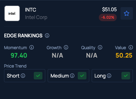 Benzinga Edge Stock Rankings show that Intel stock has a Value in the 50th percentile, but it checks out on the Short, Medium and Long Price Trends.