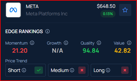 Meta holds a value rating of 42.82% and a quality rating of 94.84%, according to Benzinga's Proprietary Edge Rankings. Benzinga’s screener allows you to compare Meta’s performance with its peers.
