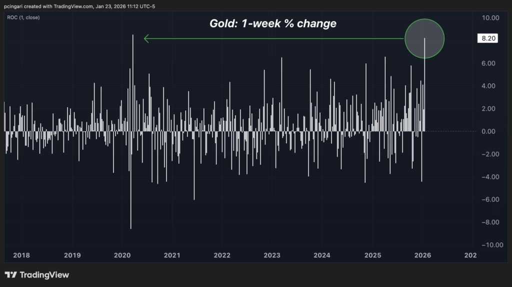 The yellow metal – tracked by the SPDR Gold Shares (NYSE:GLD) – is up over 8% on the week — its best performance since March 2020 and nearly 15% year to date, an advance few expected after gold surged 64% in 2025, its strongest annual gain since 1979.