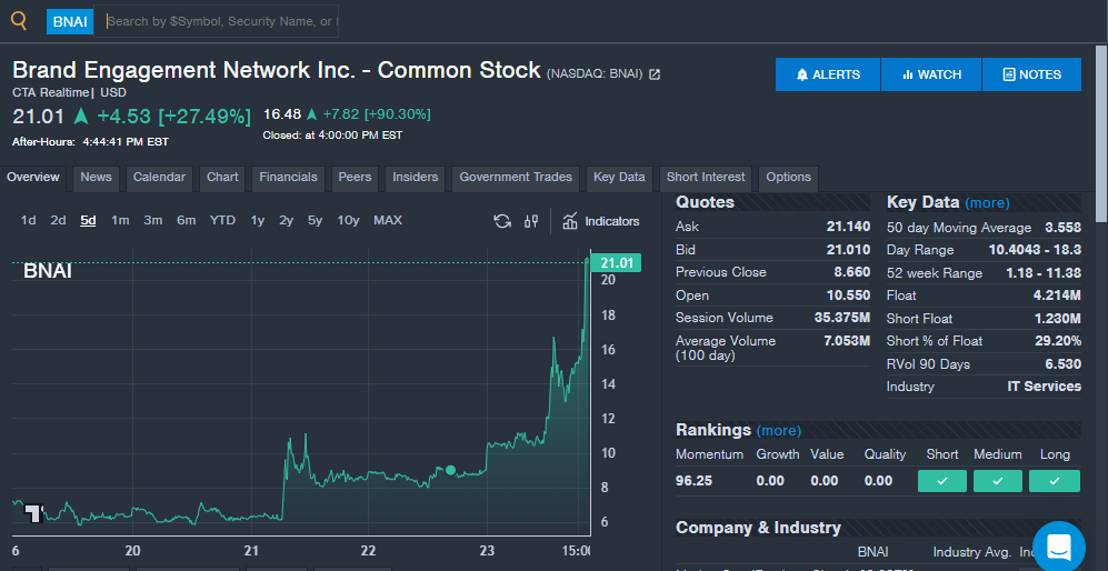 Brand Engagement Network Inc(NASDAQ:BNAI): Generative AI company Brand Engagement saw shares soar during the week after announcing international expansion. Brand Engagement announced a partnership with Valio Technologies for an exclusive AI licensing deal in Africa. The deal includes launching a new South African company, which will be owned by both companies and include a revenue share and licensing revenue for Brand Engagement Network. The company also recently signed a Latin American partnership. Recent AI partnerships could continue to put the company in the spotlight for investors. As a company valued at less than $100 million, investors will need to be prepared for volatility and recognize the stock as a potential high risk, high reward trade.