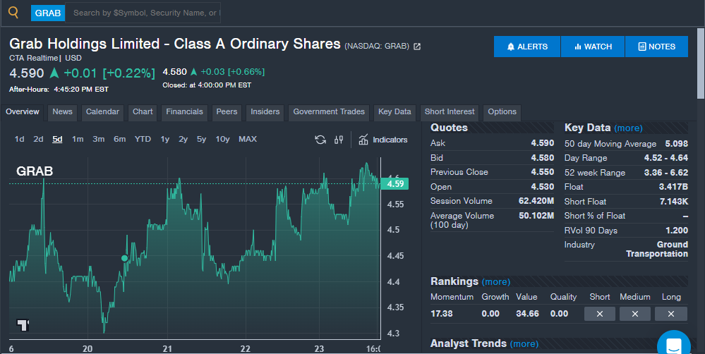 Grab Holdings Limited (NASDAQ:GRAB): Asian ride-sharing and food/grocery delivery company Grab saw strong interest from readers during the week. The company's value score saw a spike in the Benzinga's Edge Stock Rankings, which analyzes core fundamentals. In November, the company reported revenue growth and a rise in monthly active users and transactions volumes. With earnings likely coming in February, investors may be looking at shares ahead of the next report. Grab recently announced expansion in the AI sector with the acquisition of Infermove, an AI robotics company. The deal could boost the company's automated delivery options in the future. Grab recently saw its stock upgraded to Buy by analysts at Bank of America and HSBC.