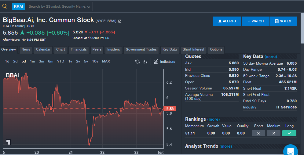 BigBear.Ai Inc (NYSE:BBAI): The AI software company saw strong interest from readers during the week, which comes after several acquisitions and company updates. The company recently announced the acquisition of generative AI platform Ask Sage, which could boost operations and future deals in the defense sector. BigBear also announced the acquisition of assets from AI-powered company CargoSeer. BigBear also announced the expansion in the Middle East with a new office in Abu Dhabi and several partnerships in the region. BigBear also signed a partnership with New England Patriots owner Kraft Group for AI and analytics to improve supply chains and decision making. The company posted a double beat in its most recent financial results after several straight quarters of missing estimates. The stock could be one to watch for the AI and defense sectors.