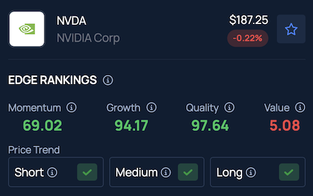 Nvidia maintains a stronger price trend over the short, medium and long terms with a poor value ranking. Additional performance details, as per Benzinga’s Edge Stock Rankings.