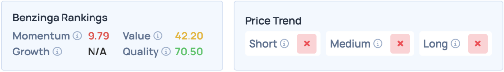 According to Benzinga’s Edge Stock Rankings, the stock scores poorly on Momentum and Value, but does well on Quality, while showing an unfavorable price trend in the short, medium and long terms.