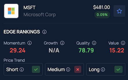Microsoft stock scores high on Benzinga Edge's Quality ranking, showing strong short and long-term price trends despite a softer medium-term outlook.