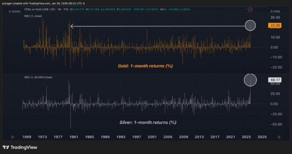 Silver, tracked by the iShares Silver Trust(NYSE:SLV), blasted through $110 per ounce. Prices are up 58% this month, putting silver on track for its strongest monthly rally ever.