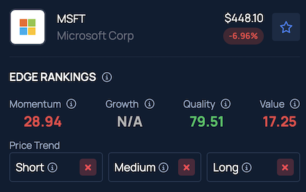 MSFT maintains a weak price trend over the short, medium and long terms with a poor Value and Momentum ranking. Additional performance details, as per Benzinga’s Edge Stock Rankings.