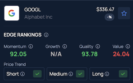 GOOGL stock ranks highly for Quality in Benzinga's Edge Stock Rankings, showing positive price trends across short, medium and long-term horizons.