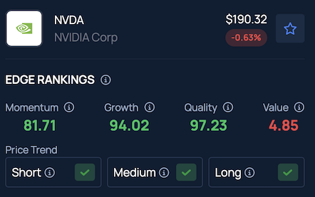 Nvidia scores strongly on the Quality metric in Benzinga's Edge Stock Rankings, supported by a favorable price trend across the short, medium and long-term horizons.