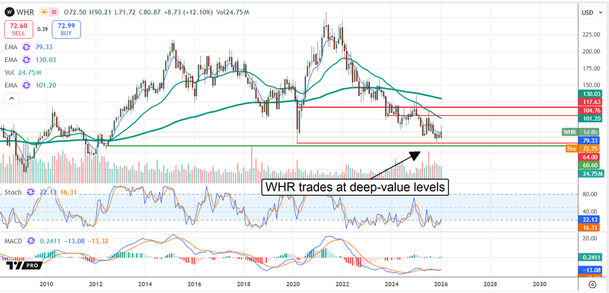 Whirlpool (NYSE: WHR) continues to struggle in 2026, with Q4 2025 results weaker than expected and guidance below expectations. However, the weakness has shares trading near the low end of a trading range, offering investors an opportunity for long-term gains. While pressures impact results today, they are primarily near-term in nature, and the long-term outlook includes a triple-digit share price increase and a high-yielding dividend.