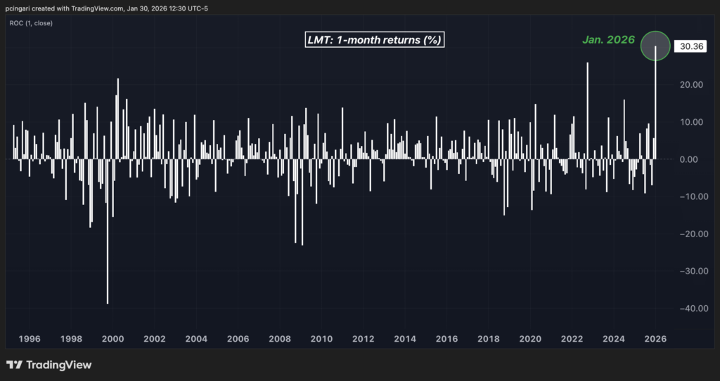 Defense giant Lockheed Martin Corp. (NYSE:LMT) jumped 30%, marking the strongest monthly gain in the company's history since it began trading in 1995.