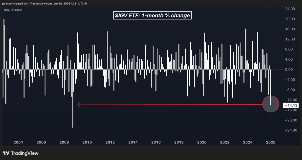 The shock reverberated across the sector, pushing the iShares Expanded Tech-Software Sector ETF(NYSE:IGV) down 14% for the month, marking its steepest monthly decline since October 2008, at the onset of the great financial crisis.