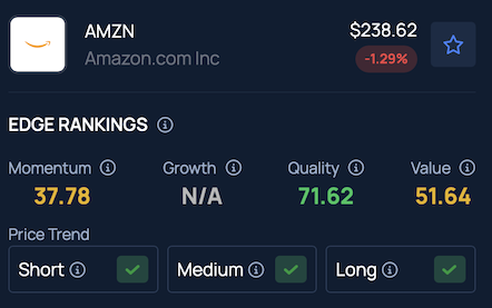 AMZN stock scores high on Quality in Benzinga's Edge Stock Rankings, with a favorable price trend in the short, medium, and long terms.