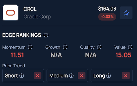 Oracle stock scores low on Value and Momentum in Benzinga's Edge Stock Rankings, with a negative price trend in the short, medium and long terms.