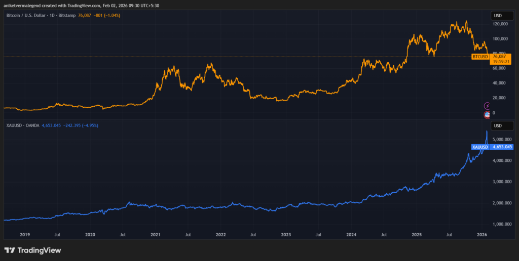 As indicated by the graph below, gold preceded Bitcoin’s bull market in the 2020-21 cycle and again in 2024-25. In the current market, the yellow metal rose to a record high of $5,590 before a sharp correction dragged it to $4,600.