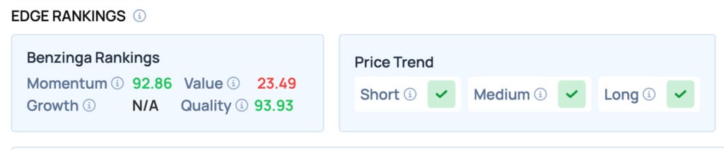 Alphabet scores well on the Momentum and Quality metrics, but offers poor Value. It also has a favorable price trend in the Short, Medium, and Long term.