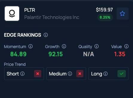 Benzinga Edge Stock Rankings show that Palantir stock ranks in the 1st percentile for Value and the 84th percentile for Momentum.