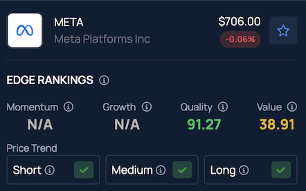 META stock ranks highly for Quality in Benzinga's Edge Stock Rankings and shows a favorable price trend across the short, medium and long-term time frames.