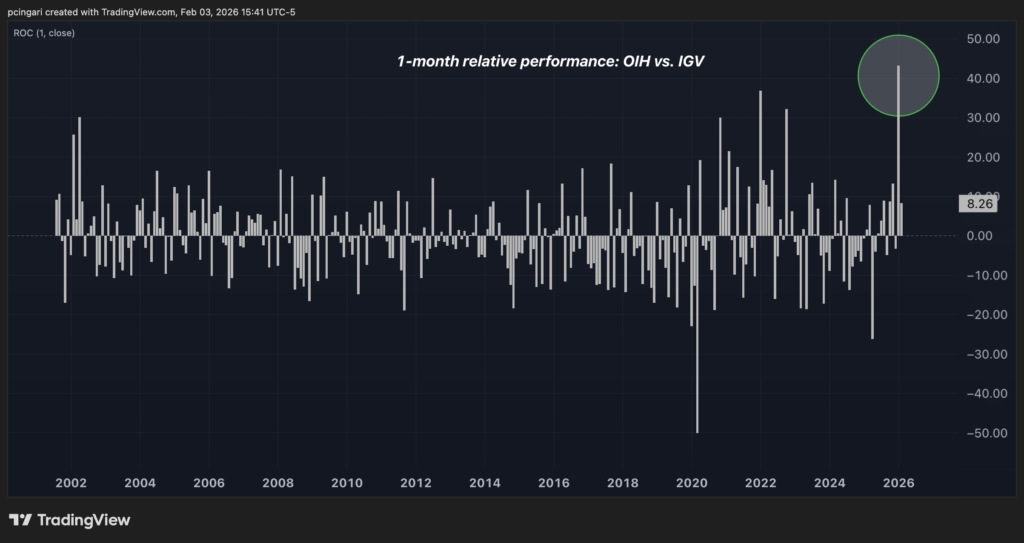 Year-to-date, the VanEck Oil Services ETF(NYSE:OIH) has crushed the iShares Expanded Tech-Software Sector ETF (NYSE:IGV) by more than 50 percentage points. The divergence was fueled by a historic January performance gap of 40ppt.