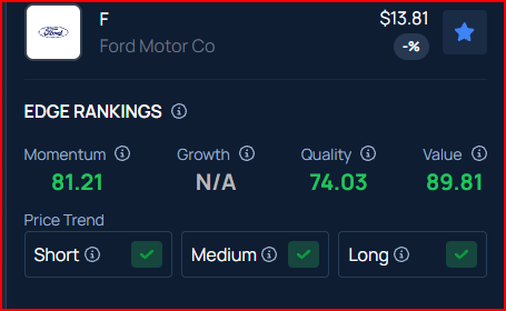 Benzinga's Edge Rankings place Ford in the 74th percentile for quality and the 81st percentile for momentum, reflecting its strong performance in both areas. Benzinga’s screener allows you to compare Ford’s performance with its peers.