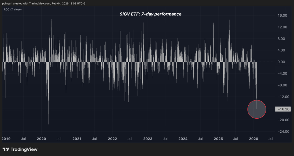 Some widely-followed momentum indicators also show signs of panic. The 14-day RSI (Relative Strength Index) on the broader IGV ETF fell to the 16 levels – the lowest since September 2001.