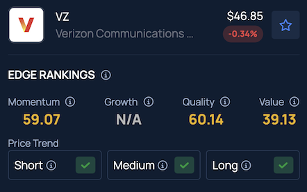 VZ shows a stronger price trend across the short, medium and long-term horizons, supported by a mid-range Value ranking, according toBenzinga's Edge Stock Rankings.
