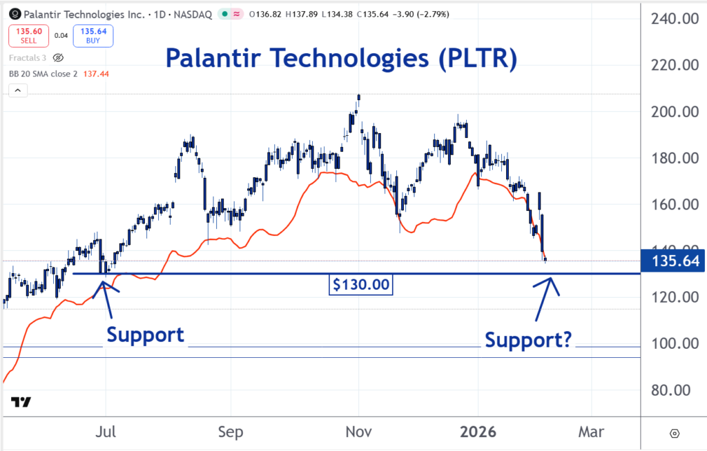 Shares of Palantir Technologies Inc. (NASDAQ:PLTR) are selling off again on Thursday. They have been in a steep decline along with most of the technology sector. But there could be support for Palantir around the $130 level. This is why we have made it our Stock of the Day.