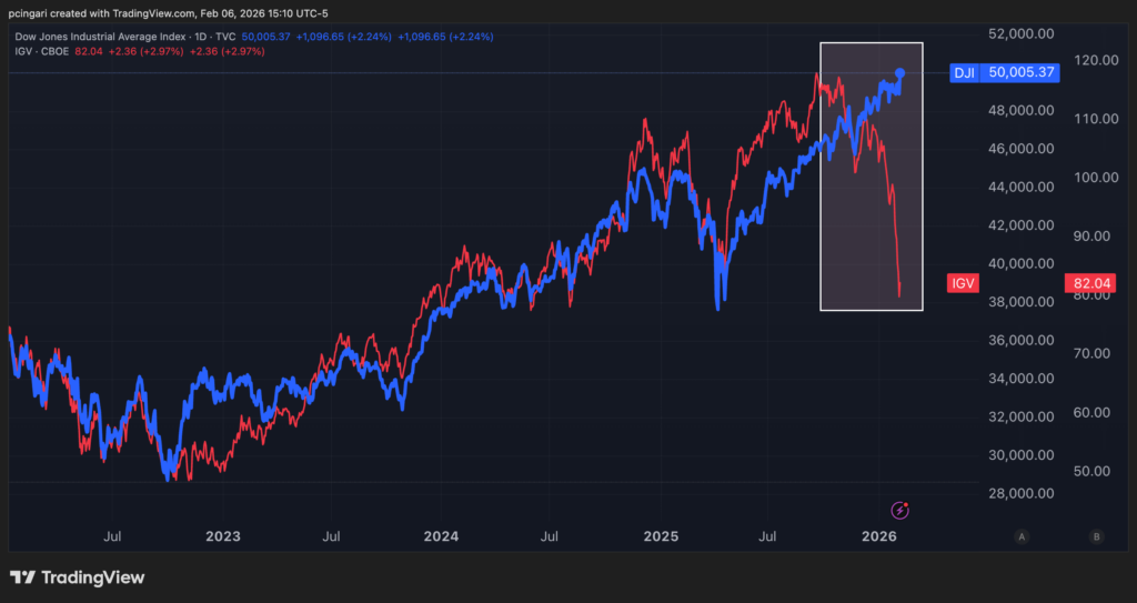 Chart Of The Week: Dow Jones Rallies To Records, While Software’s AI-Trade Falls Apart